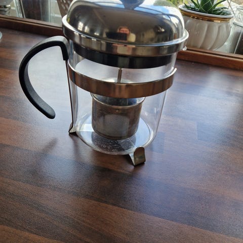 Alessi espressokanne i metall, i aluminium, med karakteristisk kuppelformet lokk. Kannen har helletut og håndtak i lys blå plast, samt blå kule på toppen av lokket. Denne kannen ble kjøpt av moren min i Italia på 80-tallet og tatt med hjem.