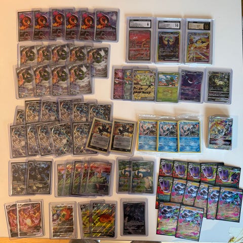 Jeg selger Pokémon samlingen min. De nyere kortene er rett fra pakker til sleeves/toploaders. Det er også masse forskjellige bulk i tins og etb fra perioden 2011-2026. Noe Holo men mest vanlig kort.