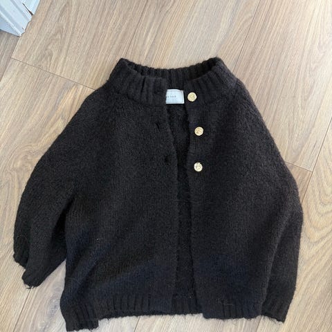 Vila genser for dame i størrelse S. Genseren er svart og laget i polyester. Modellen har rund hals, lange ermer og knapper i front med dekorative, gullfargede knapper. Genseren har en rett passform og kan brukes til hverdags eller mer formelle anledninger avhengig av styling.