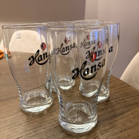 6 Hansa-glass. To av dem er med håndtak. Selges samlet.