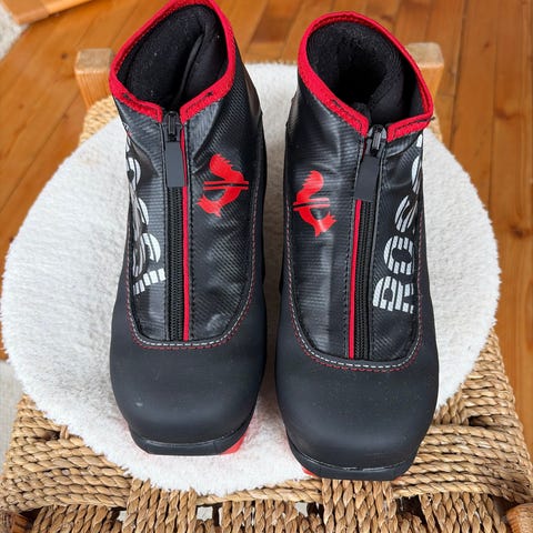 Alpina langrennsstøvler i størrelse 40. Støvlene er i svart med røde detaljer og frontglidelås. Overdel i syntetisk materiale, fôr med Thinsulate-isolasjon og kraftig yttersåle tilpasset langrenn. Egnet til klassisk langrenn på preparerte løyper. Ankelpartiet er høyt for ekstra støtte og beskyttelse mot snø og fukt.