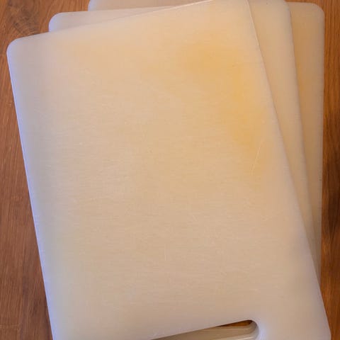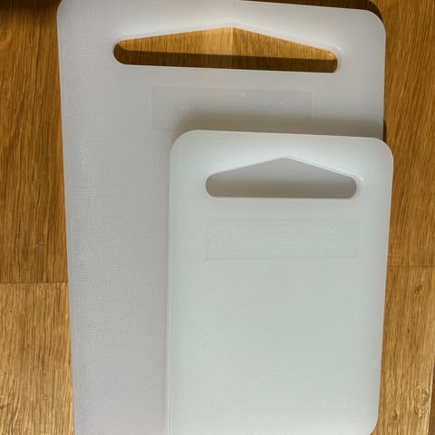 IKEA skjærefjøl i hvit plast. Rektangulær form med bærehåndtak/utskjæring i den ene enden. Tynn og lett fjøl som egner seg til oppskjæring av ulike matvarer på kjøkkenet. Kan brukes på begge sider.