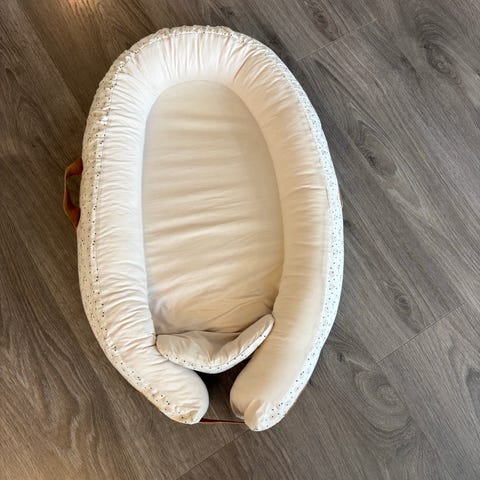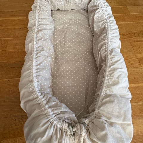 Babynestet har myke, polstrede kanter rundt hele liggeflaten og er egnet for spedbarn. Det gir en avgrenset og lun soveplass som kan brukes i seng, sofa eller barnevogn etter behov. Stoff og fyll er laget for bruk til babyprodukter. Egner seg som ekstra liggeplass eller innredning på barnerommet. Nyvasket.