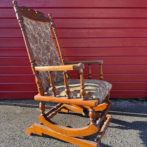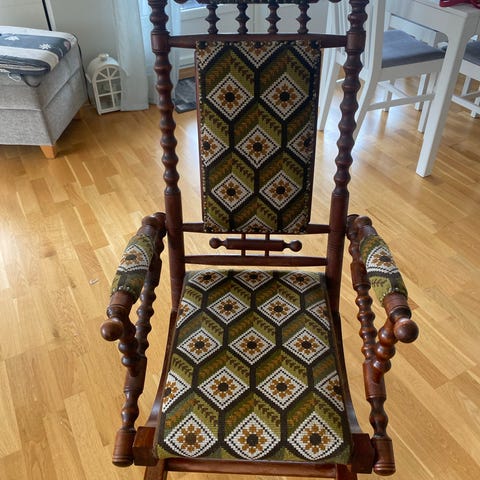 Gyngestol med polstret sete og rygg i brunmønstret stoff. Stolen har armlener og understell i treverk med buede meier som gir gyngefunksjon.