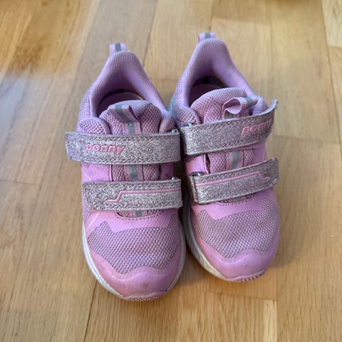 Viking joggesko for jente i størrelse 31. Skoene er i hovedsak lilla med lyse og mørkere lillatoner, samt gule detaljer.