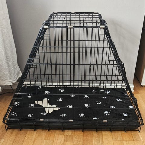 Større Stålbur med rektangulær form. Buret har gitterkonstruksjon og dør med doble låser i front. Inne i buret ligger en myk pute eller madrass i tekstil. Egnet som innendørs bur eller transportbur for hund, avhengig av størrelse på hund og bur. Farge på buret er sort metall.