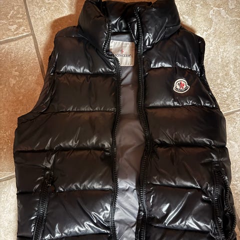Moncler vest for herre i størrelse S. Vesten er svart og har et vattert, glansfullt yttermateriale med Moncler-logo på brystet . Modellen har høy krage og lukkes med glidelås i front. Qr kode som bevis på den er ekte.