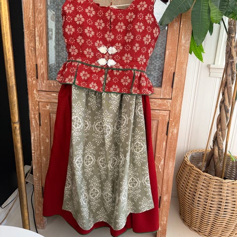 Pent brukt rød trønderbunad selges. Med skjorte, skjørt, forkle, underskjørt, sølv og veske. Jeg har også to grønne nyvaskede strømpebukser som kan følge med. Skjorta var til rens høsten 2024 og er vasket og strøket høsten 2025.