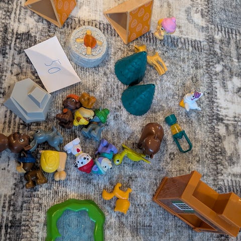 Ett sett inneholder en pose til å ha lekene i, som og kan bæres på ryggen. Et kompass, en fløyte, et forstørrelsesglass, en dyno lommelykt som ikke trenger batterier. Man sveiver for å lage strøm.