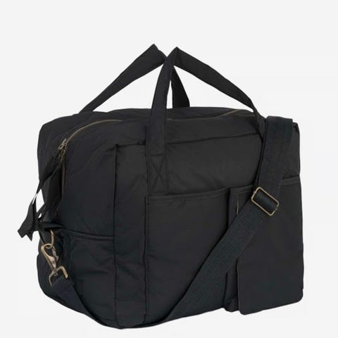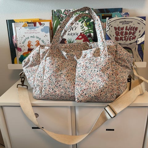 Veldig praktisk og stor veske som kan romme det meste, lomme til våtservietter, og der medfølger matchende stellematte.