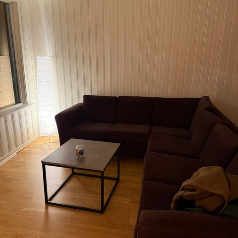 Sofagruppe med 3+2 seter fra Brunstad. Kjøpt for ca 22 år siden i gamle Jønsson i Tromsø (ikke Bohus, men måtte velge noe). Fortsatt fast og fin. Noen mindre slitasjeskader, og skade i den ene ørelappen uten at det har praktisk betydning. 3-seter: ca. 210 cm, 2-seter: ca. 155 cm. Gis bort etter «første mann til mølla» prinsippet. Bordet er solgt.