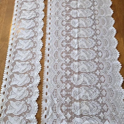 Hvit heklet blonde gardin med dekorativt mønster og buet kant. Gardinen består av lengder med gjennombrutt heklemønster og blomstermotiv langs kanten. Egner seg som vindusgardin, kappe eller pyntepanel i rom der man ønsker lett innsynsskjerming og dekorativ tekstil. Materialet fremstår som lett og luftig, og slipper gjennom dagslys samtidig som mønsteret gir struktur og detalj i interiøret.