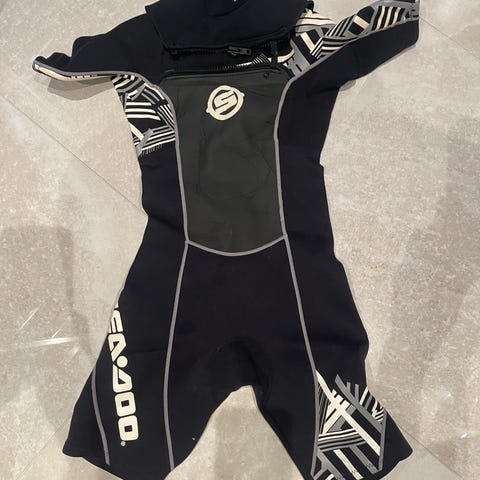 Sett med rund vannleke/tube og våtdrakt. Vannleken er rund og har rosa overflate med motiv og tau/festeliner ( strikk) Våtdrakten str xl.