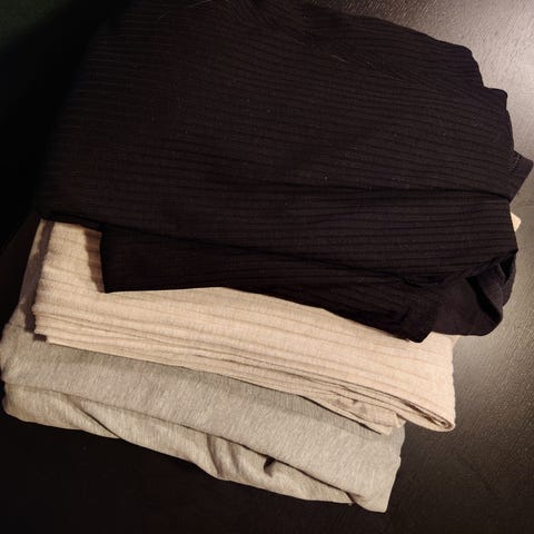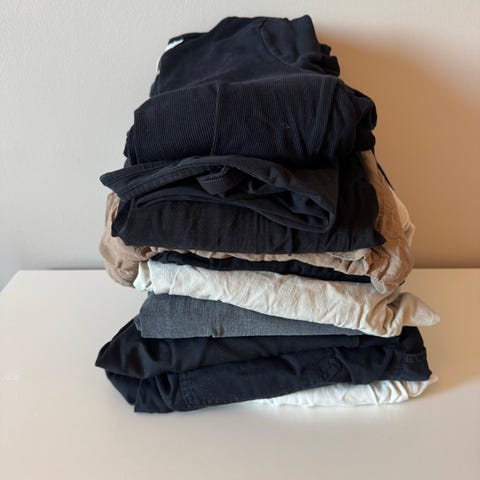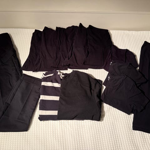Den ene buksa er str L og to av t-skjortene M, men alt passer str S.