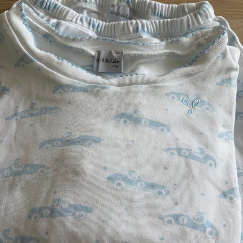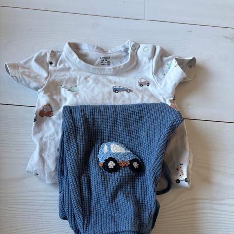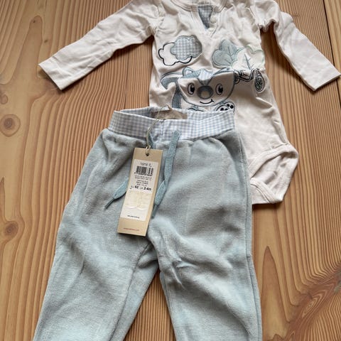 Joha ullsett for barn, unisex, i størrelse 122. Sett med overdel med lange ermer og bukse. Farge blå med ballongmønster og ensfarget blå bukse. Produsert i ull, egnet som mykt lag innerst på kjølige dager.