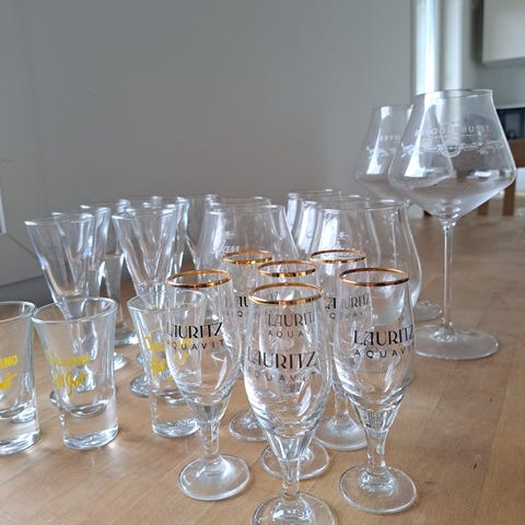 Lysholmer øl og aquavit glass Settet består av ulike størrelser glass, blant annet større glass som kan brukes til øl eller annen drikke, og mindre glass som kan brukes til likør eller snaps. Alle glassene er i klart glass med trykket dekor på forsiden. Passer til bruk ved servering av drikke ved borddekking eller som samlegjenstander.