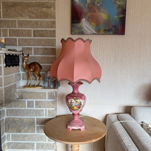 Selger en bordlampe i dus rosa med hvit lampeskjerm. Lampestetten er i porselen.