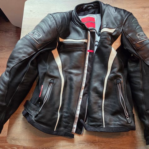 Course MC-jakke i tekstil i fargen svart. Størrelse L52. Jakken har høy krage, glidelåslukking i front og justeringsmuligheter i livet. Refleksdetaljer og lyse kontraststriper på bryst og ermer. Flere lommer, blant annet innerlomme med glidelås. Egnet som motorsykkeljakke med fokus på praktisk bruk og synlighet i trafikken. Må hentes på Nedenes eller et sted etter avtale