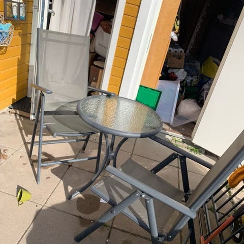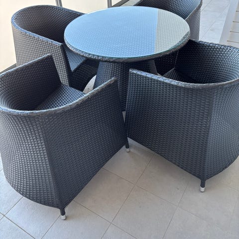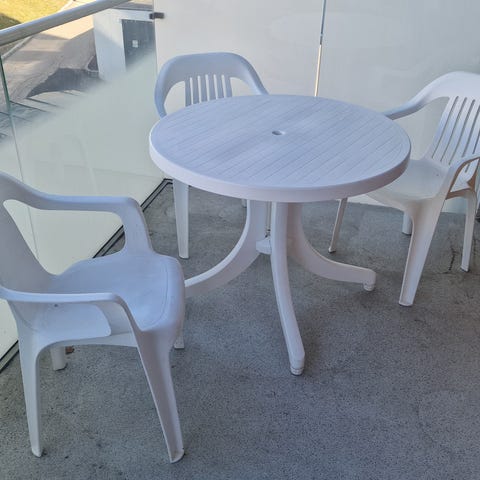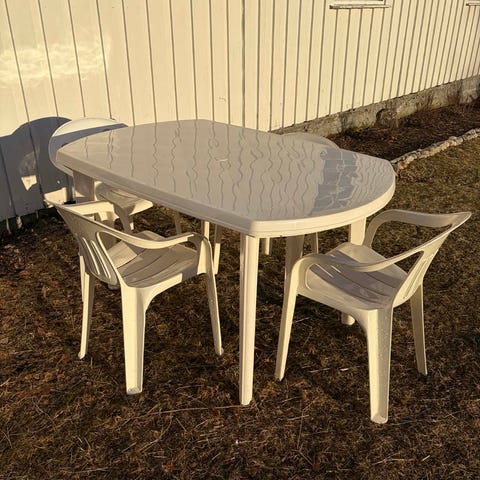 Bord og stoler i hvit hardplast. Stolene kan stables.