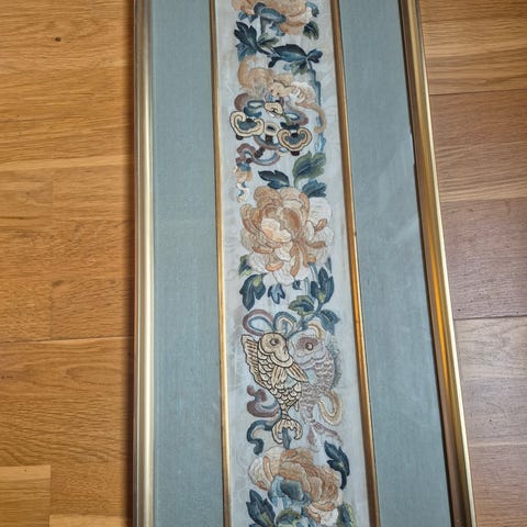 Broderiet er utført på silke med svært fine detaljer og vakre fargeoverganger. Motivet med påfugl og blomster er et klassisk kinesisk symbol på skjønnhet, harmoni og velstand.