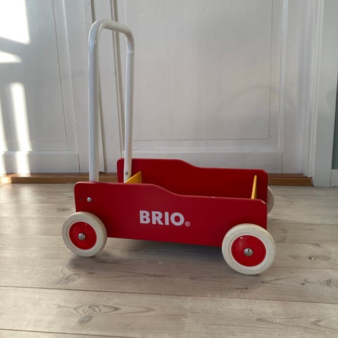 BRIO gåvogn treleke i rød farge med gul bunn og hvitt håndtak. Vognen har fire hjul og er laget i tre med metallhåndtak. Egnet som støtte når barn øver på å gå.