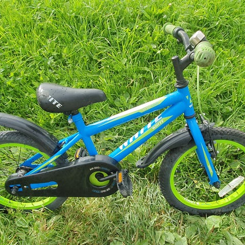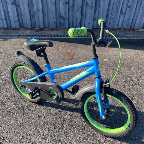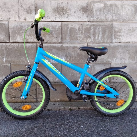 Barnesykkel 16" med blå ramme og grønne detaljer.