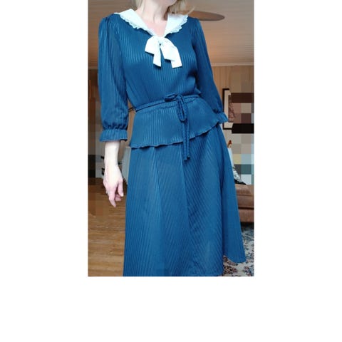 Vintage sommerkjole i bomull for dame i størrelse M. Kjolen er ermeløs og har blått og hvitt rutemønster med dekorative blonder i kontrastfarge. Modellen har knappelukking foran og flere volanger i skjørtet som gir et lett og luftig uttrykk. Passer til bruk på varme dager eller som en enkel hverdagskjole. Materiale: bomull. Farge: blå/hvit rute. Størrelse: M (dame).