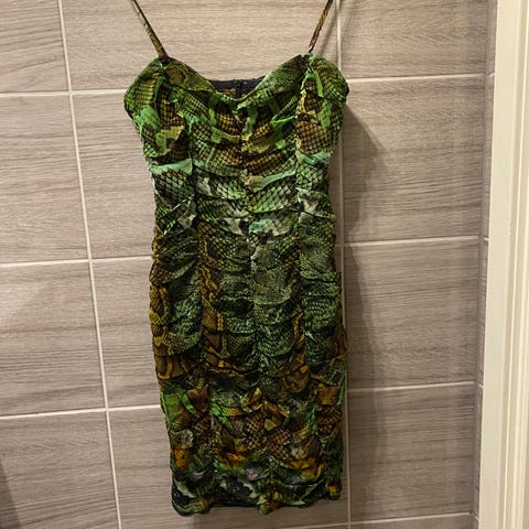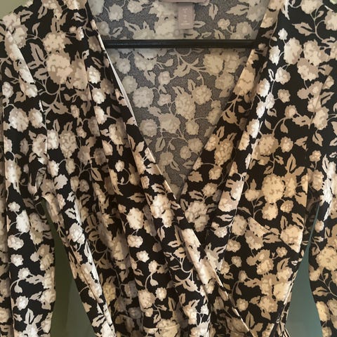 Kjole fra det franske merket Sézane. Kjole i omslagsmodell for dame i størrelse 36. Kjolen er laget i viskose og har et flerfarget bladmønster med mørk bunnfarge. Den har lange ermer, V-utringning og knytebelte i livet. Liten i str. Passer til fest og andre anledninger der man ønsker en pen kjole med mønster. Kun prøvd på.