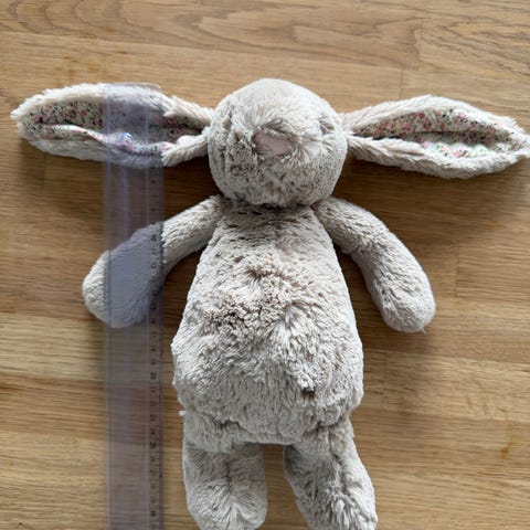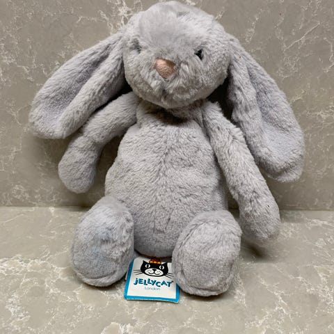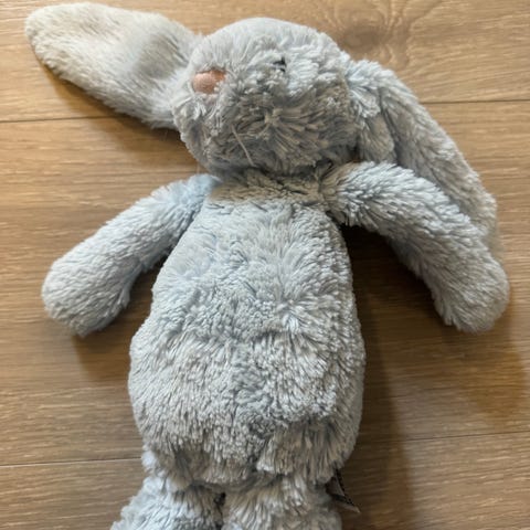 Søt liten lyseblå jellycat kanin med rangle inni selges for 180kr.