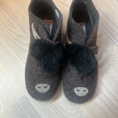 Superfit barnesko i størrelse 24 for unisex. Skoene er brune med dyreansikt-detaljer foran og borrelås for enkel lukking. Sålen er lys og merket med størrelse 24 og «non marking». Egnet som innesko eller lette hverdagssko for barn i aktuell skostørrelse.