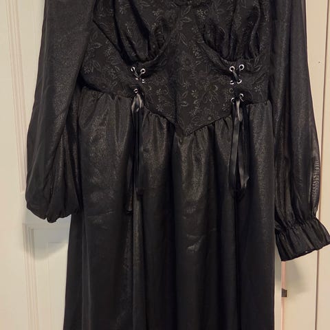 Shein festkjole i størrelse 4XL i SHEIN STR, men vil passe for en som er 2-3 XL for dame. Kjolen er laget i chiffon og har en rød farge. Overdelen har dekorative detaljer, mens skjørtet er langt og vidt med fallende stoff. Ermene er i gjennomsiktig chiffon som gir et kappepreg. Kjolen egner seg til formelle anledninger som fest, bryllup eller andre selskaper der en lang kjole er passende.