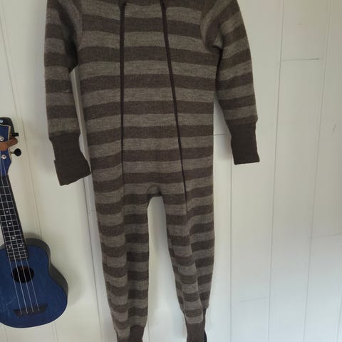Behagelig heldress med ribbet hals fra Joha som lukkes foran med knapper. Tykk og børstet ullkvalitet som er ekstra myk. Heldressen kan brukes i bilsetet eller barnevognen.