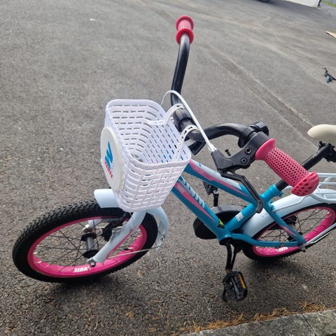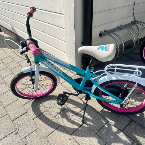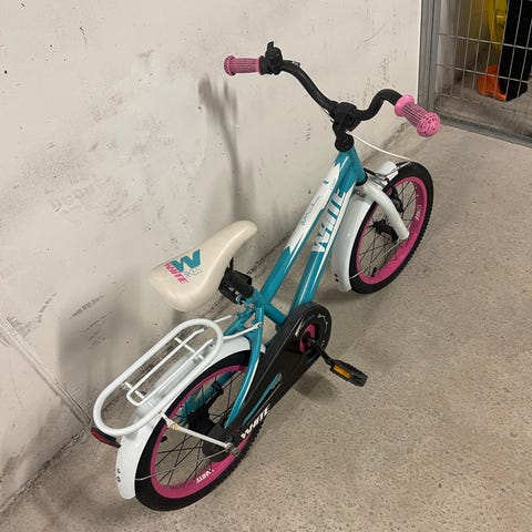 White Artic Storm barnesykkel med 16" hjul. Sykkelen har ramme i turkis med hvite og rosa detaljer, hvit sal og hvitt bagasjebrett. Hjulene har svarte dekk med rosa felger. Modellen er utstyrt med rette styreholker med rosa grep og kjedekasse for å beskytte kjedet. Egnet som barnesykkel for mindre barn som passer 16" hjulstørrelse.