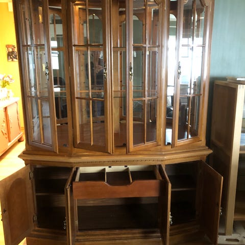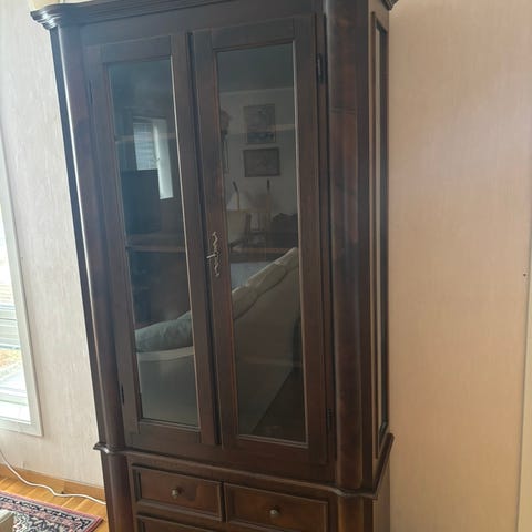 Vitrineskap i heltre kirsebær farge. Todelt skap med tre dører og tre skuffer i benkeseksjonen. Tre dører i overskap med to glasshyller. Skapet måler: B: 127, D: 39 og H: 196.