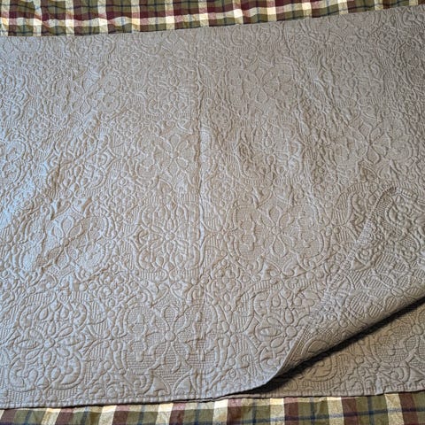 Kid sengeteppe med vaffelstruktur i beige farge.