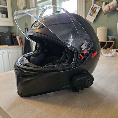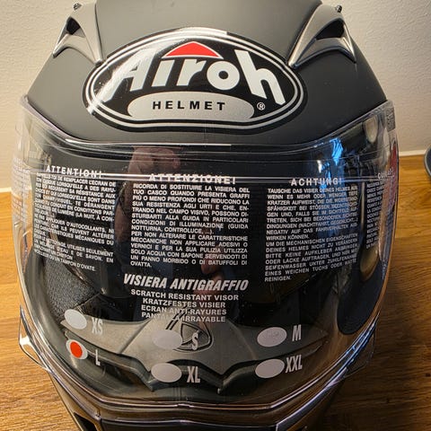 AGV k3 sv MC-hjelm i matt svart farge. Hjelmen har klart visir og integrert ventilasjon på toppen. Innsiden er polstret for økt komfort. Det er montert en cardo spirit hd intercom så man får snakket mens man kjører. Hjelmen er kun brukt 2 ganger på øvelseskjøring. Størrelse ms (57)