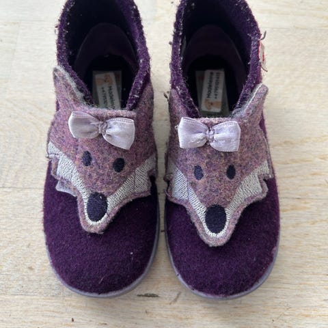 Superfit tøfler for jente i størrelse 25. Tøflene er lilla med motiv av rev og små sløyfer på oversiden. De har myk overdel i tekstil og fleksibel såle som gir godt grep på gulvet. Egner seg som innetøfler hjemme eller i barnehage.