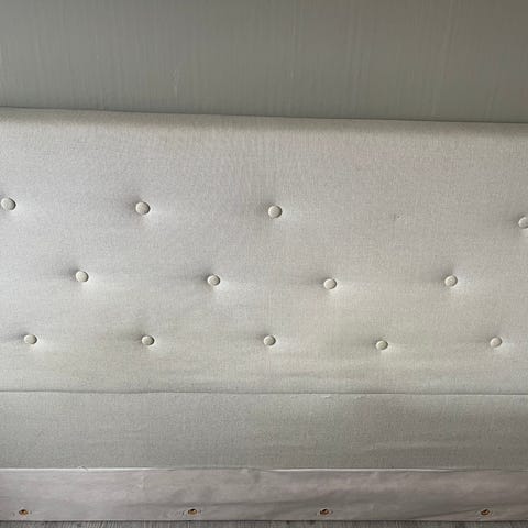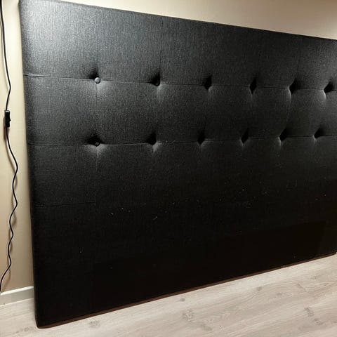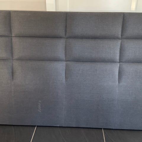 Sengegavl i mørk grå tekstil. Sengegavlen har et rektangulært design med vatterte, rutete felt. Passer til plassering bak seng for å gi ryggstøtte og beskytte veggen. Egnet for bruk på soverom sammen med passende seng og madrassstørrelse.
