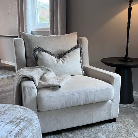 Lite brukt puff i slitesterkt stoff.