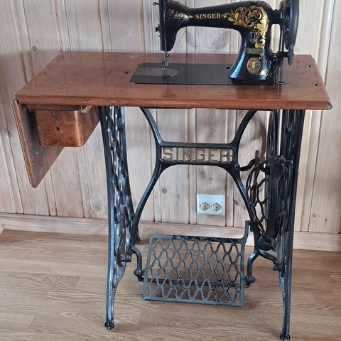 Singer mekanisk symaskin med trebord og understell i støpejern
