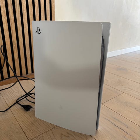 Sony Playstation 5 spillkonsoll i hvit farge. Konsollen leveres med én trådløs DualSense-kontroller i matchende farge. Denne er ubrukt.