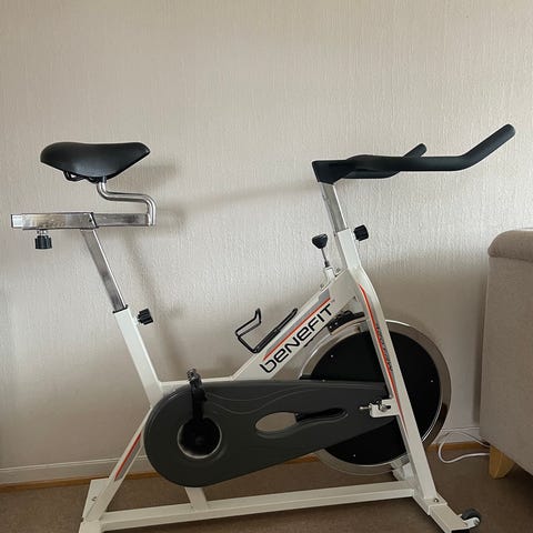 Merida Spin 1 One spinningsykkel i grå, svart og grønn farge. Sykkelen har justerbart sete og styre for tilpasning til ulike brukere. Utstyrt med pedaler med tåreimer for bedre fotfeste under trening. Egnet for innendørs kondisjons- og intervalltrening hjemme eller i mindre treningsrom.