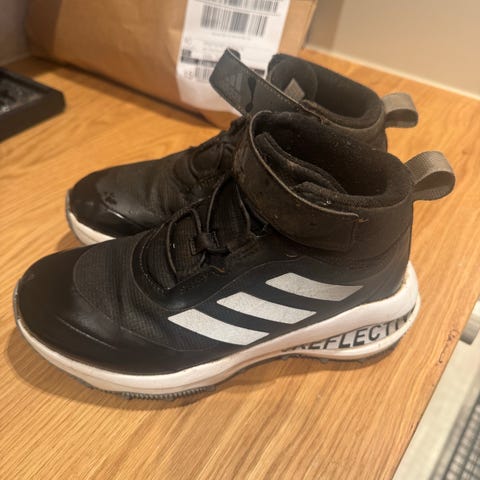 Adidas barnesko for gutt i størrelse 32. Borrelås og elastiske lisser for enkel av- og påtaking. Yttersålen har mønster som gir godt grep på underlaget. Brukt av ett barn noen uker. Slitasje foran på ene foten, som vist på bilde.