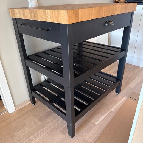 Selger dette fine trancherbordet da vi har kjøpt nytt. Supert å bruke som ekstra kjøkkenøy / benkeplass, evt bruke det som hylle ellers i huset. Godt brukt, men masse bruk igjen! To hyller under + benkeplate som gir masse oppbevaringsplass. Kan brukes som det er, eller pusse og male det, så det blir så godt som nytt igjen😊 Håper noen andre får brukt det mer! Må hentes i Sandefjord, evt kan vi frakte det til dere mot et lite ekstra beløp, dersom det passer seg:) Bør være 2 personer for å bære det!