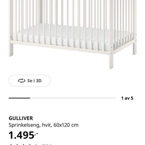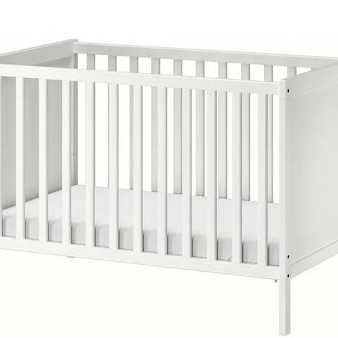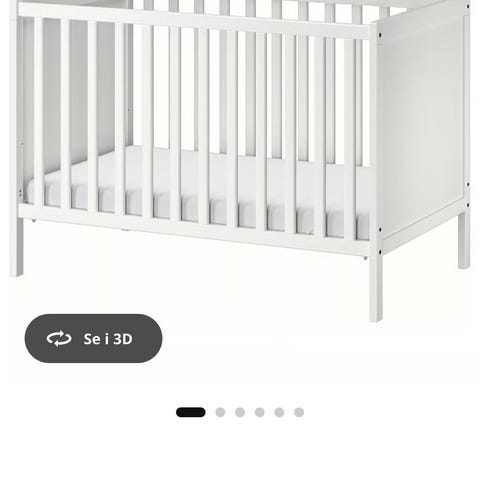 IKEA Sundvik sprinkelseng i hvit utførelse. Klassisk barneseng med tette gavler og sprosser på langsidene. Bunn med ribber i tre som gir støtte til madrassen og lufting under. Passer standard madrassmål for sprinkelseng (ca. 60x120 cm). Egnet for spedbarn og småbarn innenfor anbefalt alders- og vektgrense for denne modellen.