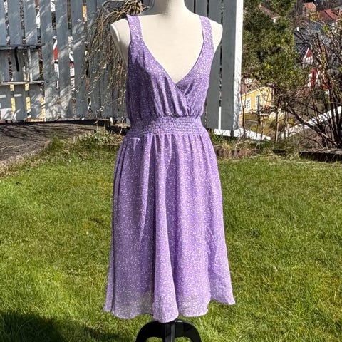 Careless sommerkjole i størrelse M for dame. Kjolen er i lilla bomull med blomstermønster. Den har brede stropper og innsvinget liv med rynkedetaljer øverst, samt utsvingt skjørt. Materialet er lett og egnet til bruk i varme temperaturer. Passer til hverdagsbruk og uformelle anledninger.