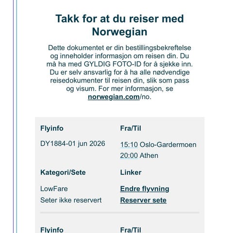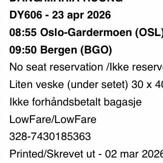 Norwegian Air flybillett Bergen–Alicante 2. mai 2026