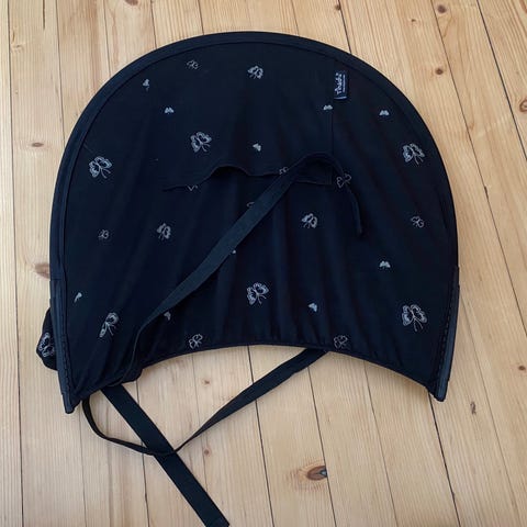 Praktisk, fleksibel solskjerm til barnevogn. Festes med flere strikker til barnevognen og kan fint henge på kalesjen på vognen hele tiden. Lett å dra frem og tilbake. Stiv bøyle i bremmen. Leveres i praktisk oppbevaringsetui.