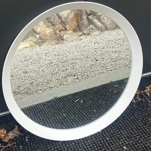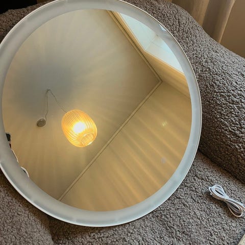 IKEA rundt speil i hvit utførelse. Speilet har en bred, rund ramme i plast med integrert hull som kan brukes til oppheng eller feste. Speilet har integrert lys i rammen, noe som gjør at den passer fint til sminkespeil. Noen av lyspærene har gått, men disse kan byttes. Rammen har synlige merker og misfarging enkelte steder, som vist på bildene. Må hentes.