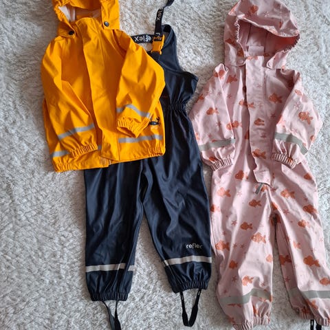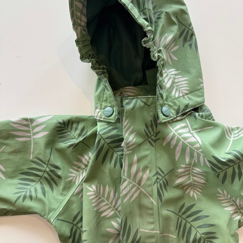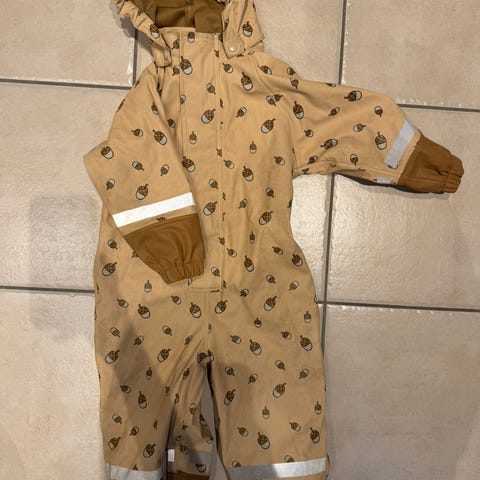 Kuling foret regndress for barn i størrelse 92. Dressen er beige og laget i polyester. Modellen er unisex og har hette, lange ermer og lange ben. Ytterstoffet er beregnet for bruk ute, med for i mykt materiale på innsiden for økt komfort. Dressen har forsterkede partier på knær og nederst på bena, samt refleksdetaljer for bedre synlighet. Lukkes med glidelås og trykknapper foran. Egnet som yttertøy for barn i barnehage- og lekesituasjoner utendørs. Mangler to knapper, og refleksen er litt slitt. Brukt av to barn, men mye bruk igjen
